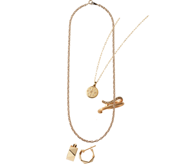 長さ違いで合わせたネックレスで、胸元にボリュームと輝きを。上から:ネックレス〈ロロマリーナチェーン〉[K10YG]¥44,000(シエナ ロゼ/シエナ ロゼ 表参道ヒルズ店)、ネックレスチェイン[K18YG]¥110,000、ネックレスに付けたチャーム[K18YG×DIA]¥187,000(共にスタージュエリー/スタージュエリー表参道ヒルズ店)、イヤ-カフ[K10YG×ブラウンDIA]¥33,000(エテ ビジュー)、ピアス〈ジオメトリーフープピアス〉[K18YG×K10YG]¥39,600(テイクアップ)