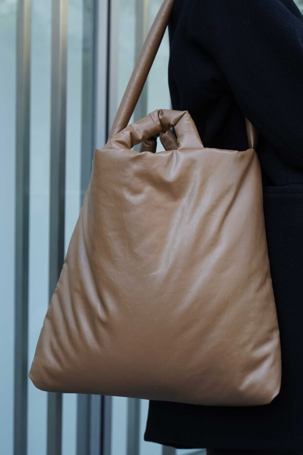 「全体をビターなトーンでまとめながらも、パッチワークが施されたブラックデニムやパフィーなバッグなど個性のあるアイテムで自分らしさをプラスしました。暗配色ならディティールのあるアイテム同士もぶつからず、コーデに奥行きを出すアクセントとして活躍してくれます」