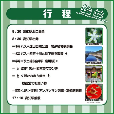 遠山自然公園での希少植物観察会や、四万十川と沈下橋の散策、岩本寺でランチ、くぼかわまち歩き、松鶴堂で買い物といった、希少植物と町の魅力に出会う、秋のしまんと旅になっている。