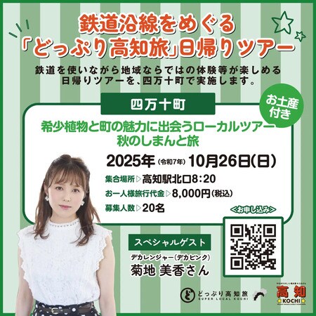 「どっぷり高知旅キャンペーン」の一環として開催されるのは、一般参加者が、スペシャルゲストと一緒に秋の高知の魅力をどっぷり楽しむことができる日帰りのモニターツアー。