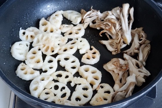 4. れんこんとまいたけを入れ、さつまいもと同様に焼きます。