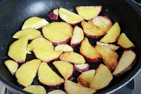 3. フライパンに油を熱し、さつまいもを重ならないように並べて中火で焼きます。両面がこんがり焼けたら、お皿に取り出しましょう。