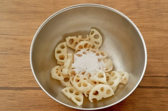 2. さつまいもとれんこんの水気をしっかり拭き取り、表面に片栗粉をまぶします。