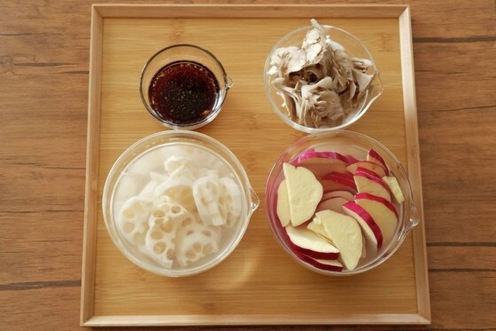 1. さつまいもとれんこんは半月切りにして水(れんこんは酢水)にさらします。まいたけは手で裂いておき、タレ用の調味料は合わせておきましょう。