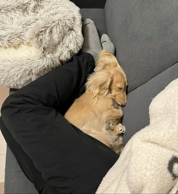 飼い主さんが寝転んでできた三角形に、すっぽりおさまったわんちゃん。すやすや寝ていて、安心しきっている様子が分かります。狭い場所にムギュっとおさまる様子をみると、飼い主さんに甘えている気持ちが伝わってきて癒やされますよね。