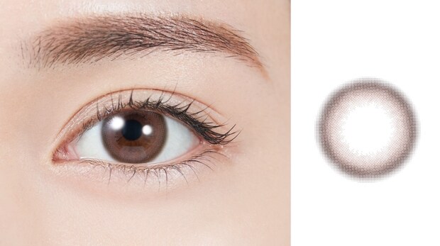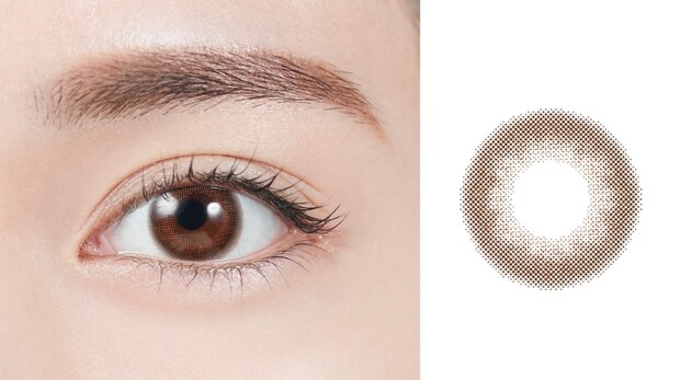 外側のダークブラウンと内側のライトブラウンの色づかいが奥行き感のある瞳を演出。自然なグラデーションのフチ、明る過ぎないカラーでカラコンビギナーさんにもオススメ。[レンズ直径:14.2mm、着色直径:13.4mm]
