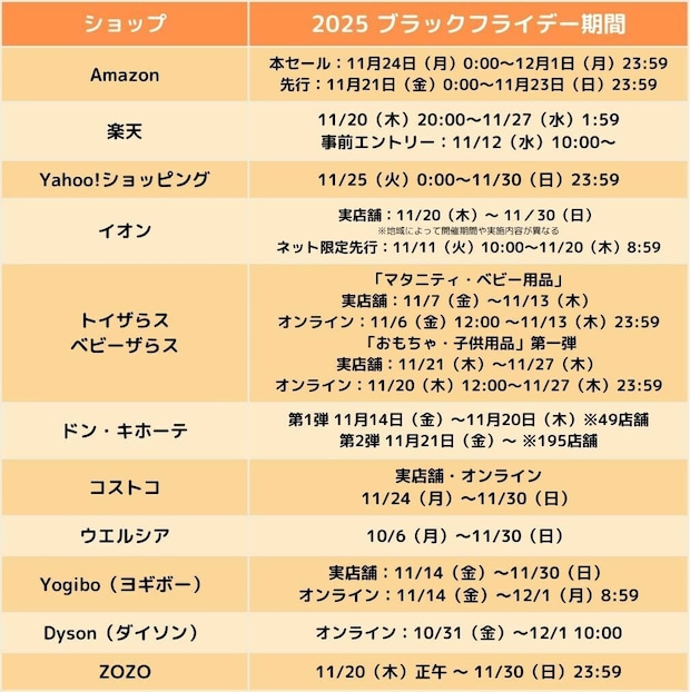 2025年のブラックフライデーの各社の日程を簡易的にまとめました!お買い物のスケジュールを立てる上でお役立てください。
