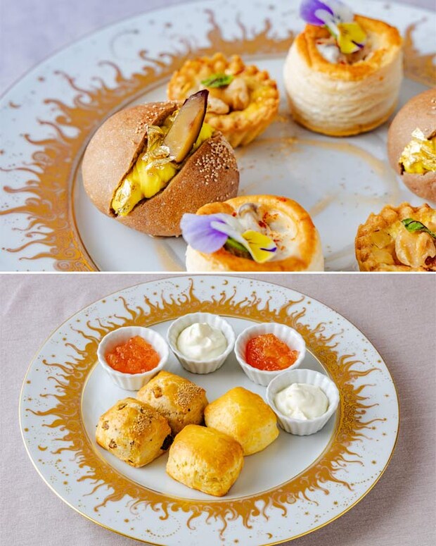 スイーツの合間のお口直しにぴったりな3種のセイボリーに、自家製2種のスコーンも。多彩なマロンの魅力を感じながら、ほっこりする秋の味わいを楽しんで。
