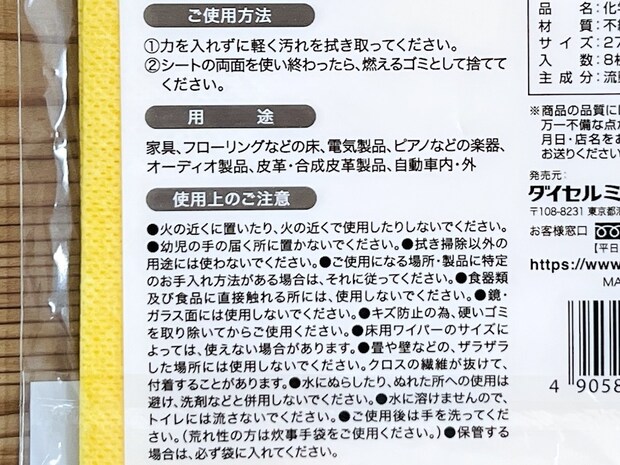 使い方は「力を入れずに軽く汚れを拭き取るだけ」と、いたってシンプル。ただし注意点もいろいろあるため、パッケージ裏面の説明書きをよく読んでから使用しましょう。 使用上のおもな注意点