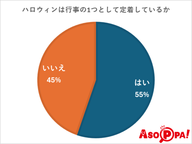 ハロウィンが近づくと、あちこちでハロウィンイベントが行われたり、商品が並んだりすることから大分定着しているかと思われましたが、結果としては半々ぐらいということでした。