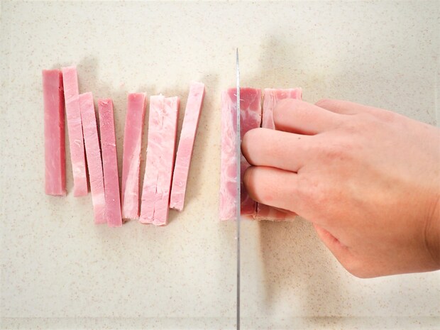 6. ベーコンを大体きのこと同じくらいの大きさに切る。