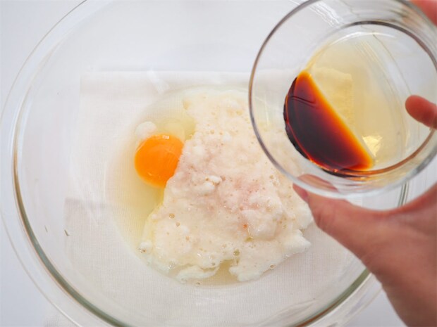 2. 長芋を洗い皮を剥き、1のボウルにすり入れる。