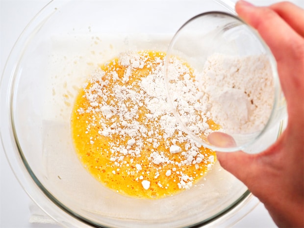 4. 薄力粉を加え、さらに混ぜ合わせていく。