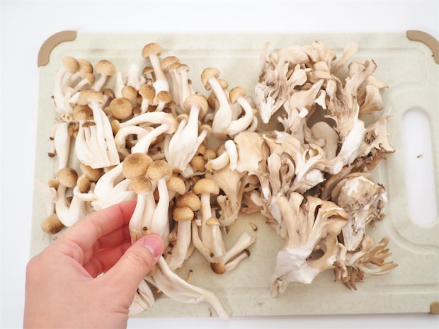 5. しめじの石づきを切り落とし、しめじ、舞茸を食べやすい大きさにさく。