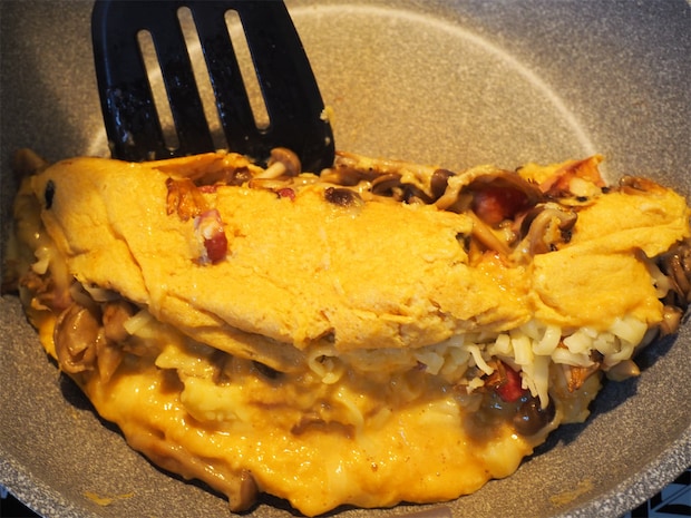13. 底面が固まったら、具材を包むように半分に折り、形を整えて出来上がり。