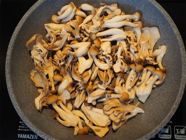 塩、こしょうを加えたらしばらく放置。じゅーっと音がしてきたら1度混ぜるようにして炒めていくとのこと。まずは油なしできのこの水分を飛ばしていきます。この工程が、きのこの香りを凝縮する「非常に大事」なポイントとのこと。もし油を入れないと焦げてしまうという方は、出来る限り少ない量で調理してください。加熱してしばらくすると、ぶわっときのこのいい香りがしてきますよ♪