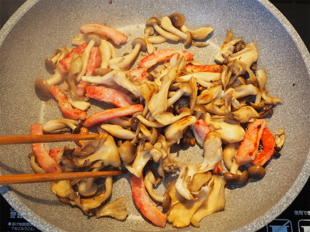 ベーコンの旨味をきのこたちに絡めていきます。ん〜、おいしそう。