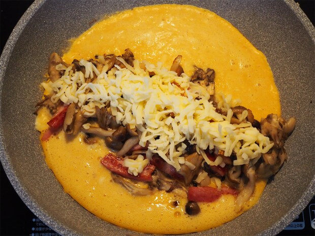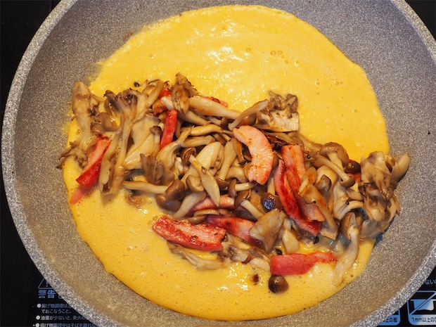 11. すぐに具材を卵液に乗せるようにして真ん中に寄せ、空いたスペースに残りの卵液1/3量を流し入れる。