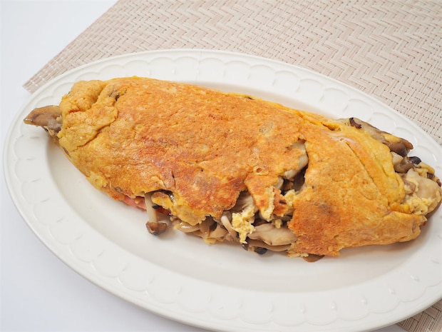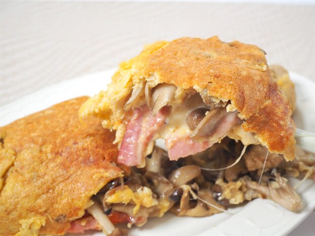 オムレツを切るとチーズがとろ〜り♪具材がころっと溢れ出してきます!くまの限界食堂さんは濃厚な味わいと言っていたけれど、本当だった!きのこの香りも豊かで、旨味が逃げずにぎゅっと詰まっています。長芋をたっぷり使った生地は少しねっとり感もありつつも、ふわっとした食感。それでいて、満腹度はかなり高く感じられます。どこかキッシュのような味わいや食感なので、言われなければ長芋だと気がつかないかも!今回はきのこでしたが、ほうれん草を入れてもおいしいとのこと。好きな野菜をたっぷり食べられるところも魅力的ですね。