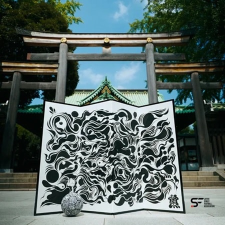 「街蹴球-SASHI」は、黒線と称された独自の流線模様で万物を描き出すSOLID氏が、屏風と連動したデザインを施したボール。