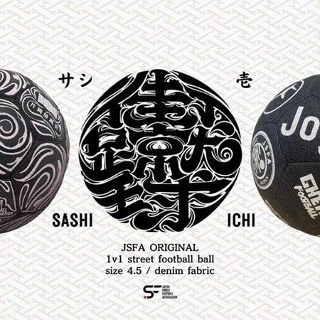 1つは国内外パートナー企業のロゴを配した「街蹴球_ICHI(壱)」。もう一つは、拠点墨田区の「片岡屏風店」にあるアーティスト・SOLID氏が描いた屏風とコラボレーションした「街蹴球-SASHI(サシ)」だ。いずれも数量限定で、日本ストリートサッカー協会のHPにて数量限定で近日販売予定とのこと。