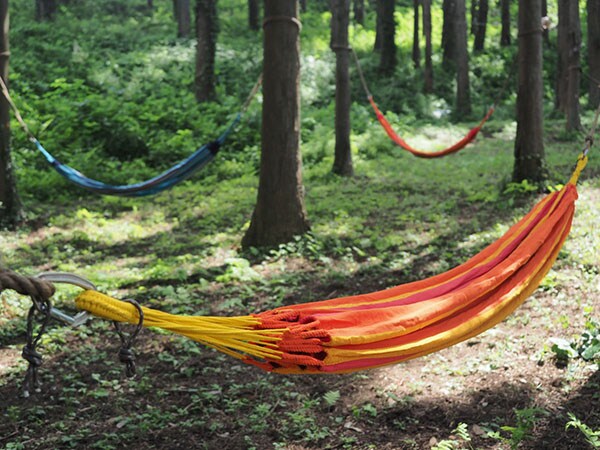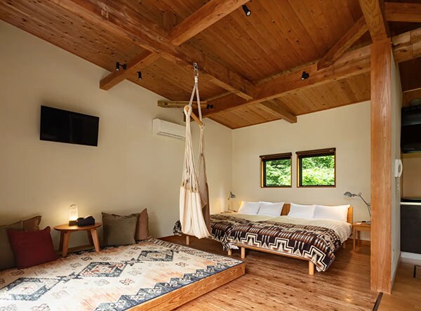 森を眺めながらハンモックを楽しめる「ハンモックテラス」など、植物園と調和したグランピングテント27棟、コテージ18棟、計45棟が植物園内に立ち並ぶ。