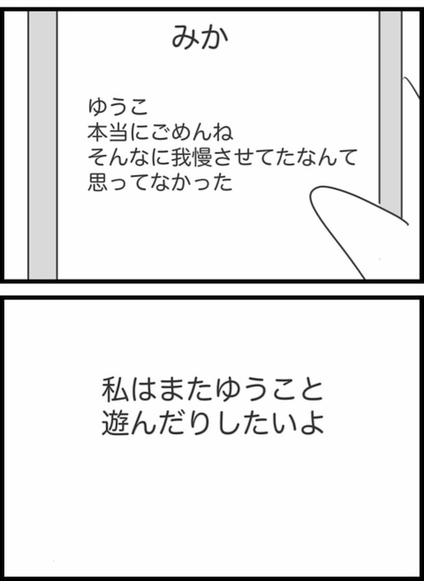 みかから届いたメッセージには謝罪の言葉とまたゆうこと遊びたいという気持ちが書かれていました。ゆうこはこのメッセージにどう返事をするのでしょうか。