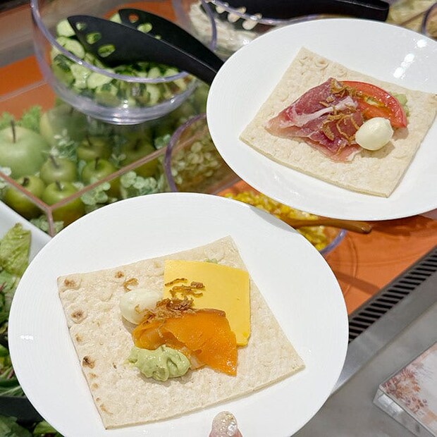 続いて、「クラフトフラットブレッド」のコーナーへ。生地の上にのせる具材が選べるんですよ。今回は、ワカモレディップ、サーモン、モッツァレラチーズ、チェダーチーズ、フライドオニオンを選びました。