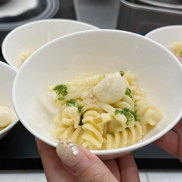 塩気のある料理もいただきましょう。これはなんだろう?と思ったら、パスタのようです。りんごも加えるようで、どんな味になるのかワクワクしてしまいます。