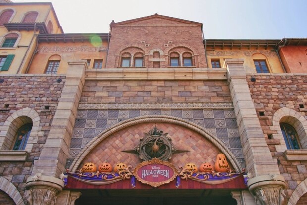 ディズニーシーのエントランス上には、カラー・形が異なるかぼちゃたちが!ディズニーランドのエントランスはブルーのかぼちゃがメインとなっていましたが、こちらはオレンジを基調としていて、温かみのある雰囲気になっていますね。