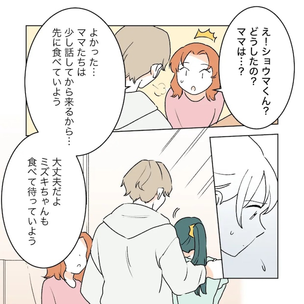 意外すぎる人物の登場に驚くアカネ。ショウマは平静を装って「ママたちは少し話してから来るから・・・先に食べていよう」と言いました。