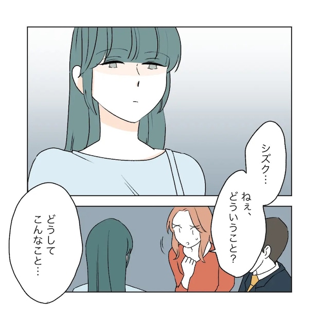 高校の同級生だったワタルとシズク夫妻。久しぶりに地元に戻ったカエデ。そして、カエデの妹サクラと高校時代から付き合っていて、今は夫になったショウマ。当時お互いに好きだけれど思いを伝えられないまま、ワタルはシズクと、カエデはショウマと付き合い始めてしまったと勘違いしてお互いを諦めた背景には、シズクの策略があったのだとショウマとサクラはずっと疑っていました。カエデもまさかシズクが、と思いながらもやはり疑いを拭い去ることはできませんでしたが、シズクの娘ミズキとカエデの娘アカネが同じクラスで仲が良いことで関係を断ちきれずにいました。ある日、カエデに何の連絡もなしに、ミズキと同じ習い事に通うアカネを連れ出したシズクは、ミズキとアカネに噓をつき、アカネをレストランに残して帰ってしまいます。アカネはシズクと一緒にいる可能性が高いと思ったカエデ、ショウマ、ワタルの3人は、ミズキのGPSを頼りにシズクの居場所を突き止めます。カエデたちに追いつかれまいとミズキと一緒にその場を去ろうとするシズクですが、先回りしたショウマに行く手を阻まれます。カエデは「アカネはどこにいるの!?」とひどく動揺した様子でシズクに迫りますが、全く口を開こうとしません。埒が明かないと思ったワタルは、ミズキにアカネが今どこにいるか聞くと、「お店でアカネちゃんママと一緒にいるって・・・」とシズクを見ながら心配そうに言いました。ショウマは動揺するカエデを落ち着かせながら、自分がアカネを迎えに行くから終わったら連絡してと言い、ミズキと共にその場から離れていきました。いよいよワタル、シズク、カエデが3人で直接話すときがきたようです。