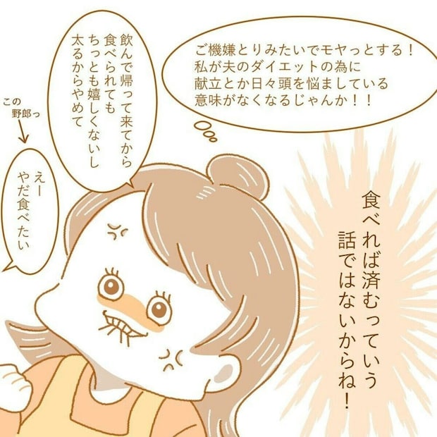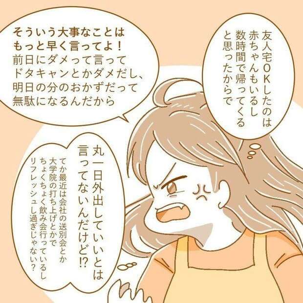 ところが、友人宅へ行ったあと、飲みに行く約束をしたなんて…。しかも、前日の夜に報告をする夫。おかずはもったいないですが、ドタキャンするわけにもいきません。