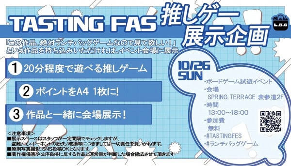 「TASTING FES」を行うLUNCH BAG GAMESは、小型・携帯型のボードゲームに特化した試遊イベントを主催する団体。ボードゲームコミュニティサイト「ボドゲベア(bear.cool)」を活用した情報発信を行い、ゲームデザイナー、パブリッシャー、プレイヤーが交流できる場を提供している。