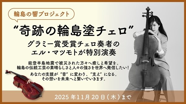 同プロジェクトでは、グラミー賞受賞チェリストのエル・マツモト氏を迎え、輪島市にて“奇跡的に無傷で見つかった「輪島塗のチェロ」”を使った特別コンサートを開催。その様子とともに、輪島の素晴らしさと人々の強さを発信する映像を制作し、2026年1月1日(木・祝)に全世界へ向けて公開する。