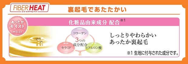 裏起毛であり、接触温感機能によって暖かく、加えて「化粧品由来成分(コラーゲン・セラミド・ヒアルロン酸)」を配合しているため、しっとりとしてやわらかい履き心地が実現されています。 環境に配慮したポリエステル繊維が使われています。