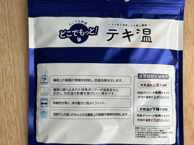 肌に触れると暖かく感じる接触温感機能を持ち、抗菌防臭効果を備え、毛玉ができにくいように作られています。