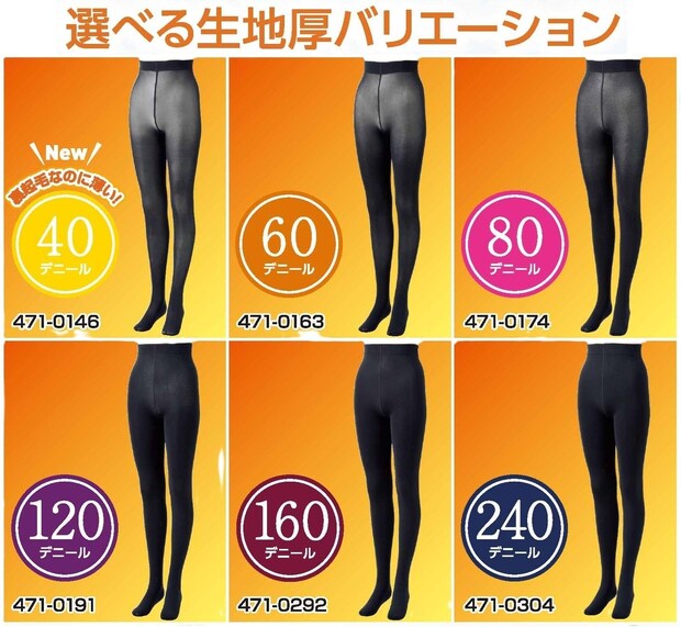 40、60、80、120、160、240デニールという多彩な厚さを用意し、今年は、シリーズの中で最も薄い裏起毛タイツ・レギンスとして「40デニール」が新たに登場。 ※7桁の数値は品番を表しています。