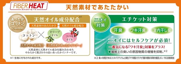 天然素材の綿に「天然オイル成分」を配合し、暖かさに加えてやわらかく肌ざわりの良いインナーです。
