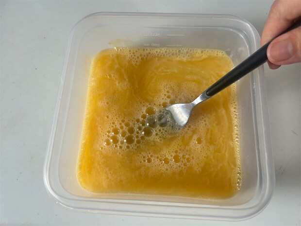 1. 電子レンジ対応の容器に卵を入れて、フォークで泡立つまでかき混ぜる。水を入れてさらに混ぜ合わせる。
