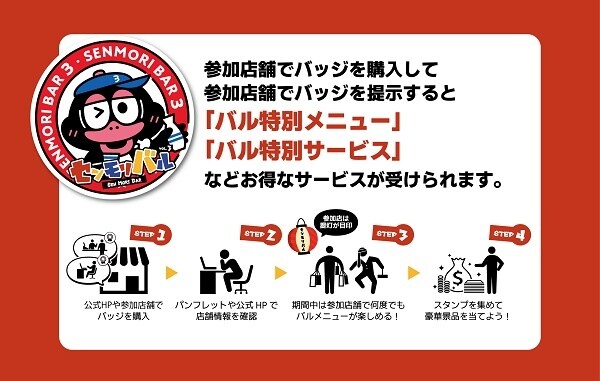 「センモリバル」への参加方法はとってもシンプルで、参加店舗や公式HPでイベント参加証となるバッジを購入するだけ。参加バッジは1人につき1つ必要で、期間中何度でも使用可能。