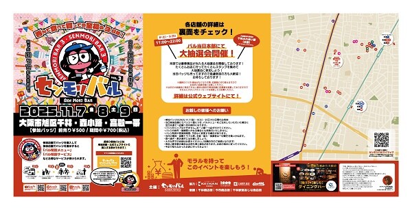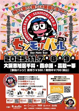 センモリバル実行委員会は、大阪三大商店街の一つである「千林商店街」をはじめ、今なお活気に満ち溢れた商店街がひしめく大阪市・旭区にて、今年で3回目となるバルイベント「センモリバル Vol.3」を、11月7日(金)・8日(土)・9日(日)の3日間開催する。