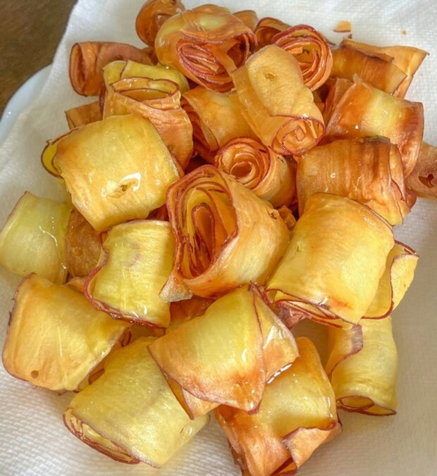 さつまいもをスライサーで薄く切り、丸めて爪楊枝で固定。180℃の油でこんがり黄金色になるまで揚げ、ハチミツをかけると、カリッと美味しく仕上がります