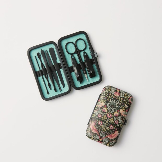 通常号の付録はウィリアム・モリスといえばの「いちご泥棒」柄の身だしなみセット。持ち運びもしやすいコンパクトなケースに、手元や顔のお手入れに便利なアイテムがなんと8点も収納されています。ツールの色を黒にしてシックな見た目にもこだわりました。
