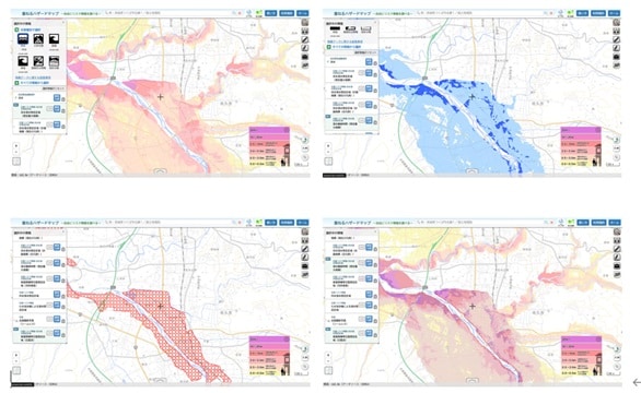 左上から時計回りに、浸水想定区域、浸水継続時間、家屋倒壊等氾濫想定区域、3つの情報を地図上に重ねたもの 出典:「重ねるハザードマップ」