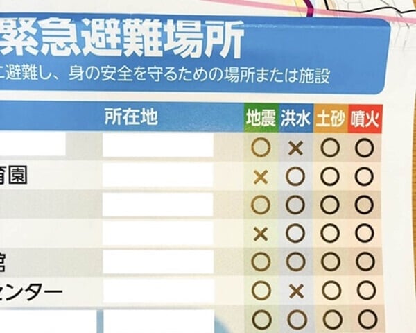 市が配布する防災マップにも、災害の種類によって避難先として適切かどうかが◯×で記載されていました