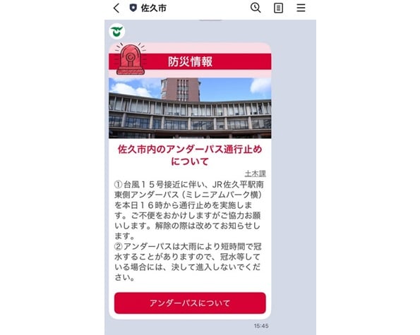 台風接近に伴う大雨でアンダーパスが通行止めになったとき、市の公式LINEから配信された防災情報