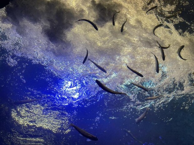 滝つぼを見上げる形で見学できる珍しい水槽で、訪れた際には絶対に抑えておきたい見どころポイントです!