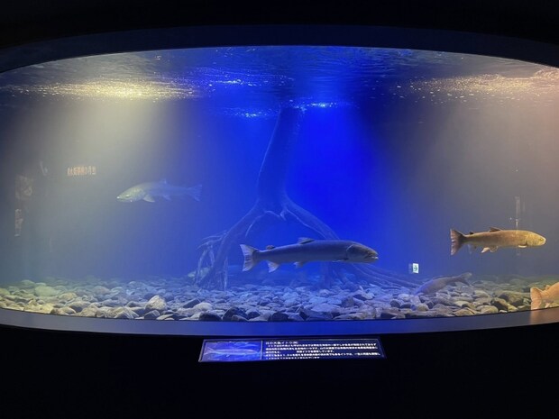 日本最大の淡水魚・イトウが展示されている、「イトウの大水槽」!イトウは北海道の一部でしか生息が確認されておらず、幻の魚とも呼ばれています。