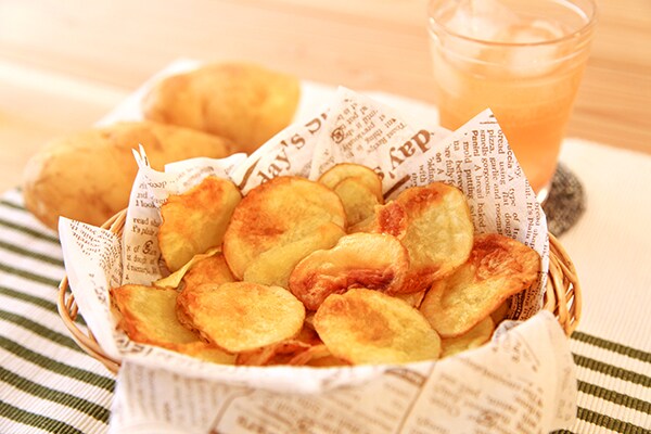 じゃがいもを切る際は、包丁ではなくスライサーで均等に薄く切っておくとよさそう。…というのも、今回は包丁で切ったのですが、薄さにバラつきがあり、パリッとおいしく仕上がったものと、しんなりイマイチなものになってしまい、ちょっと反省。成功したほうはパリッとした食感が楽しく、シンプルな味でヘルシー。子どもも喜んで食べてくれるはず。